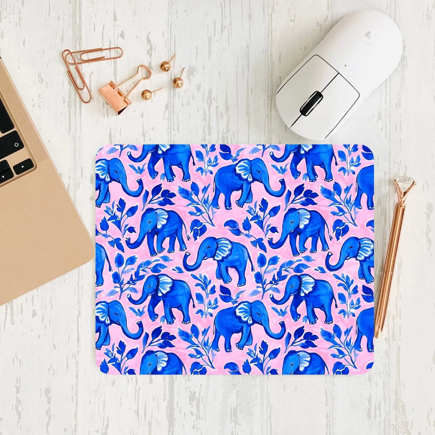 Desktop workspace with laptop, white computer mouse, pink and blue elephant patterned cloth, gold pen, pink paper clips, and gold push pins on a white wooden surface.