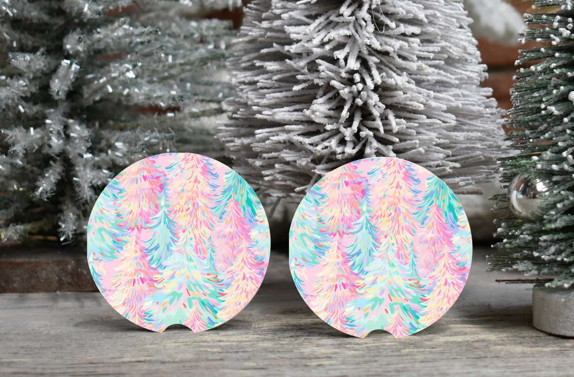 Decorative holiday scene featuring two round objects with pastel marbled patterns on a wooden surface, flanked by snow-dusted miniature Christmas trees and holiday decorations.