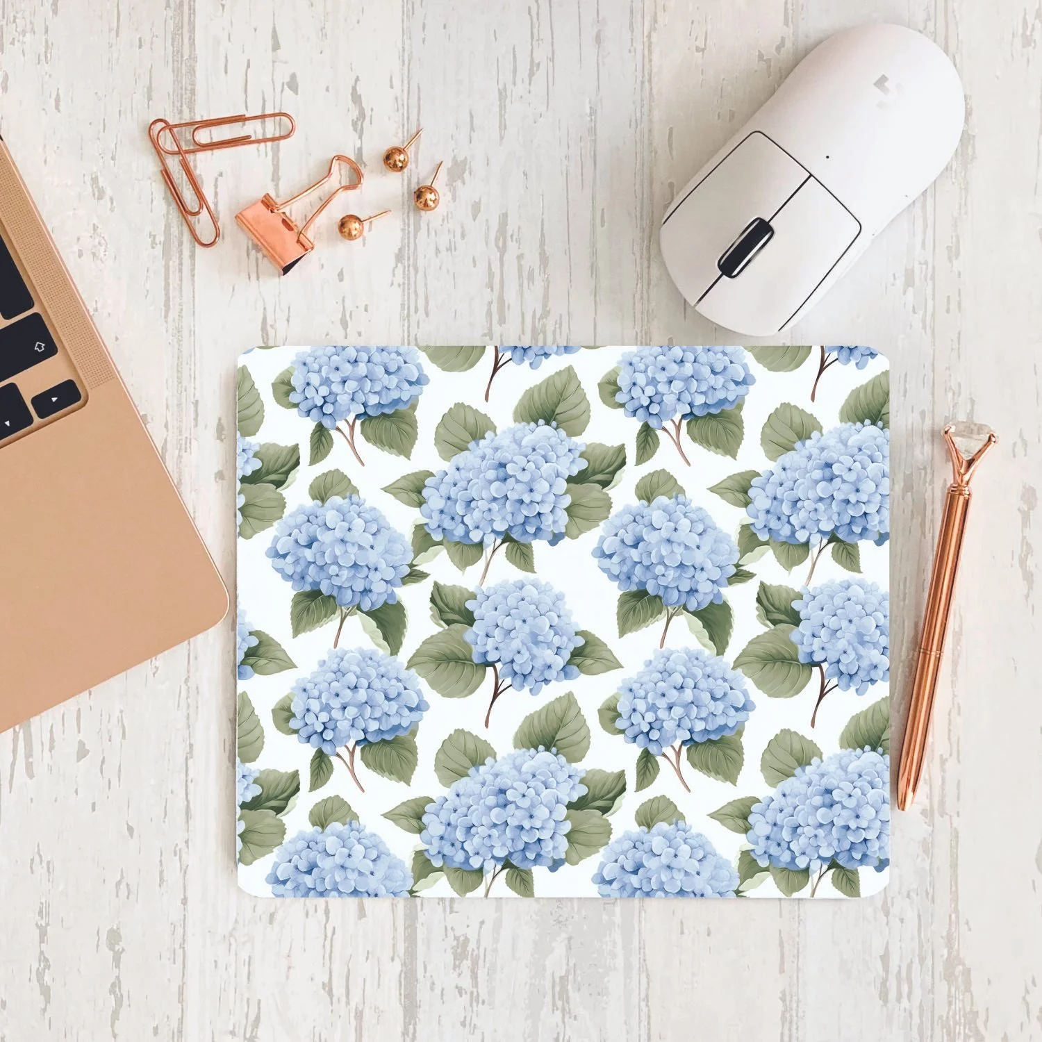 Flat lay of a workspace with a colorful floral pattern mouse pad, a white computer mouse, a gold pen, a portion of a laptop, a rose gold paperclip, a rose gold binder clip, and rose gold thumbtacks on a white wooden surface.