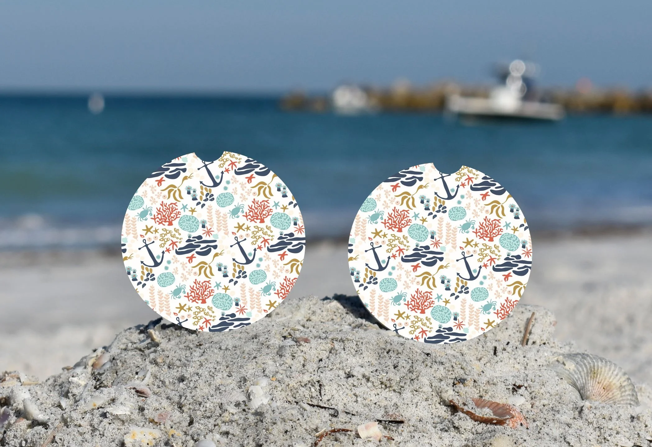 Two circular cutouts with a nautical pattern of anchors, coral, seashells, and starfish placed on a sandy beach with a blurred ocean and boats in the background.