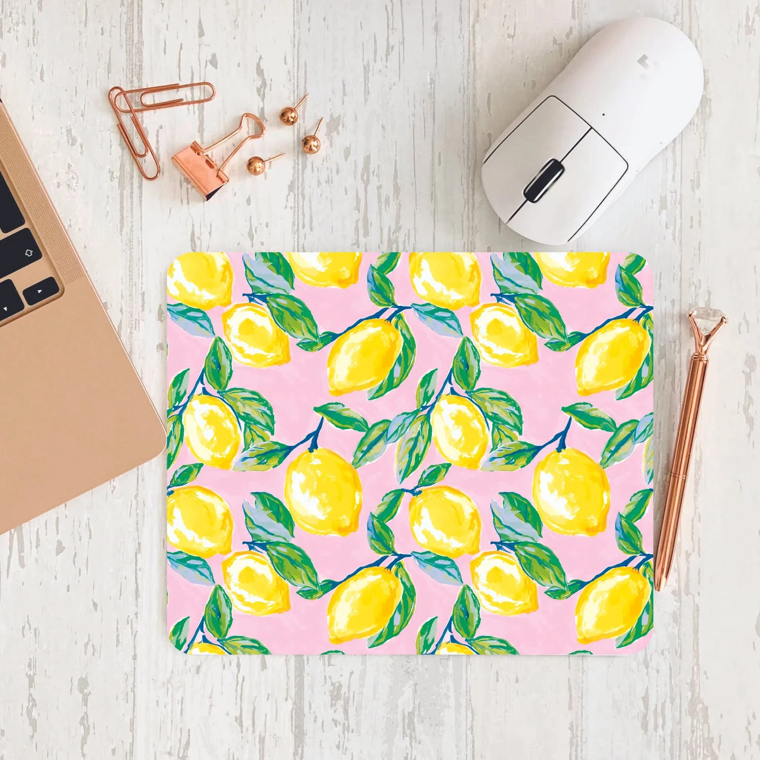 A flat lay photo features a laptop, a wireless mouse, a patterned laptop sleeve with yellow lemons and green leaves on a pink background, pink paper clips, gold push pins, and a gold pen on a white wooden surface.